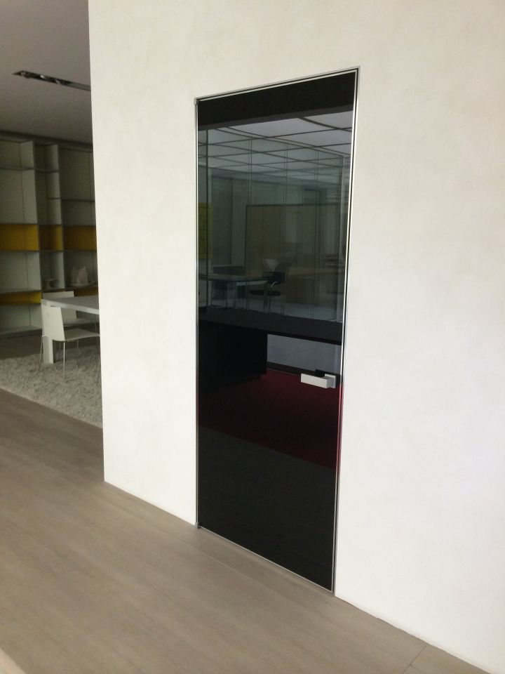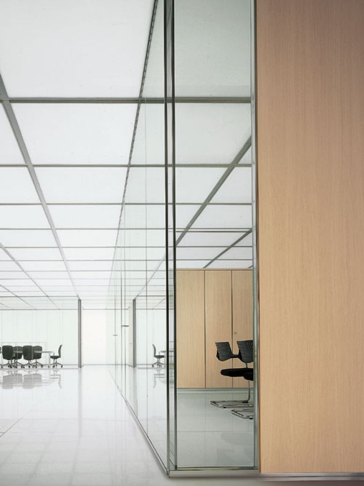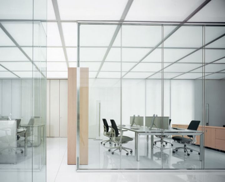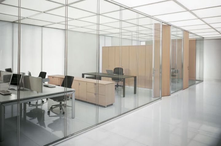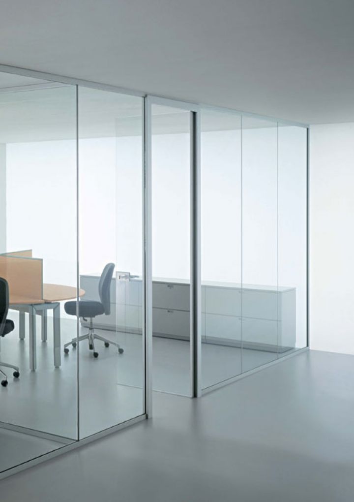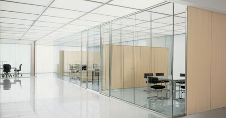 - суцільноскляні одинарні офісні перегородки зі скла. Ціна таких виробів найдоступніша. Виконуються з загартованого полотна з товщиною 8-12 міліметрів. Використовується також профіль (в нього вставляється полотно) і фурнітура. Для заповнення вертикальних стиків застосовується силікон або спеціальні вставки з пластика (прозорого), сталі, алюмінію. Бажаючи замовити ці скляні перегородки в офіс, врахуйте, що вони забезпечують звукоізоляцію в межах 25 дБ.