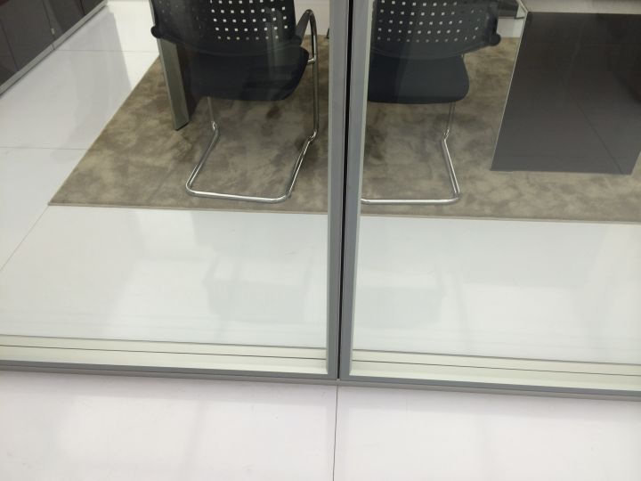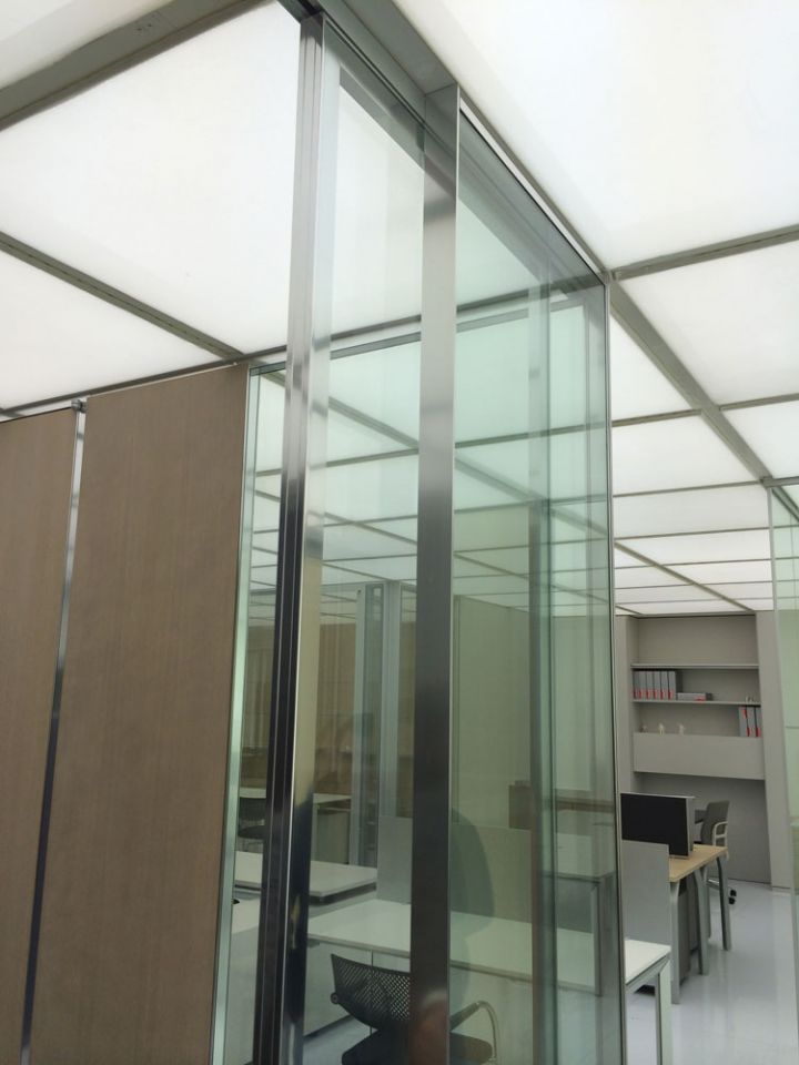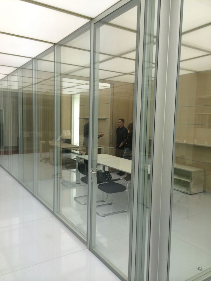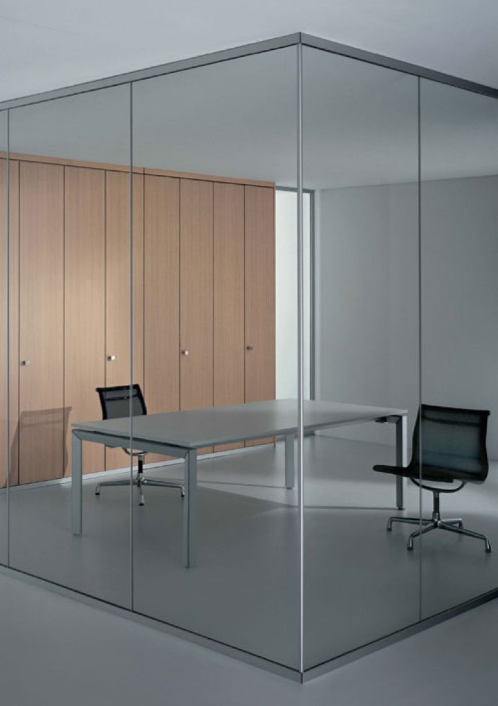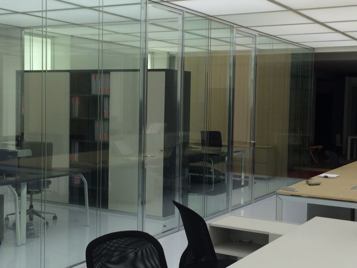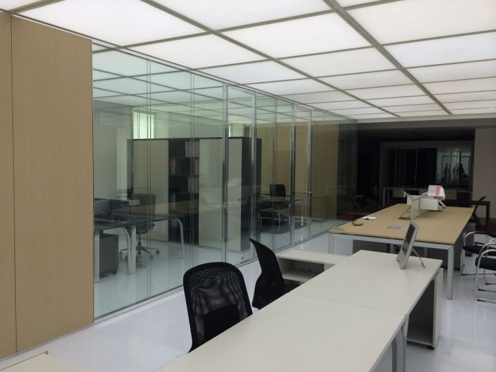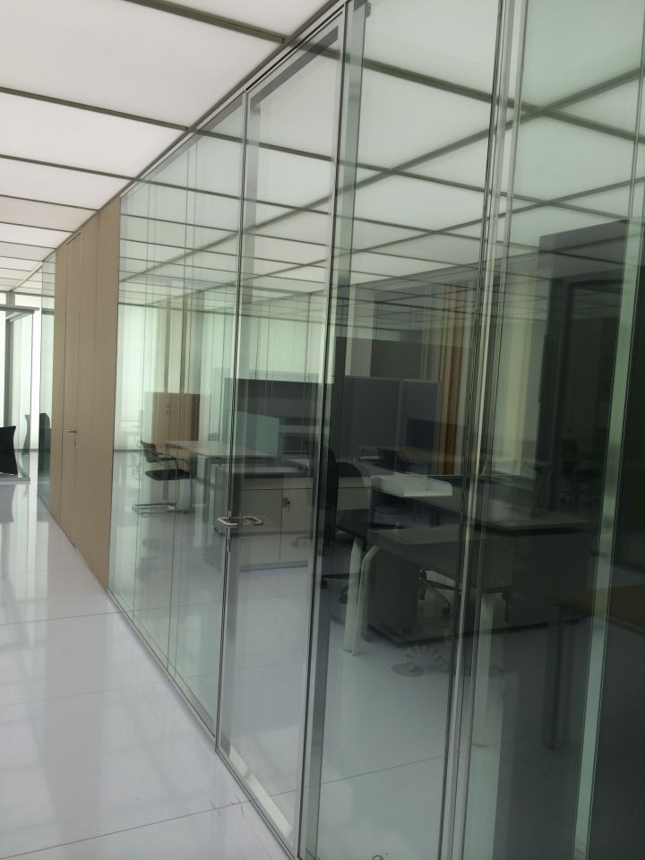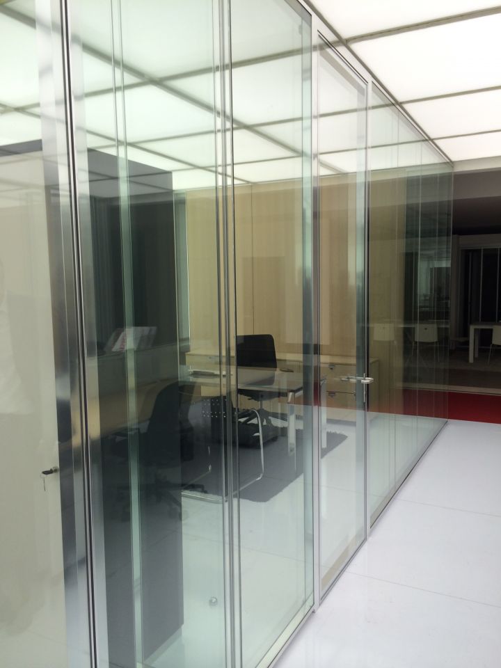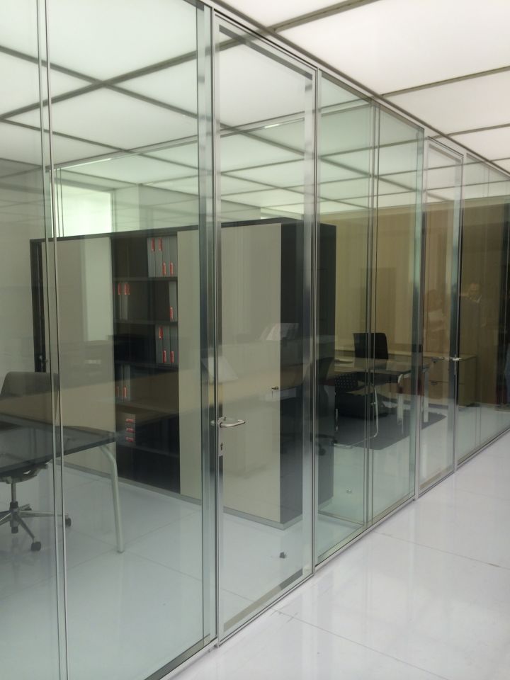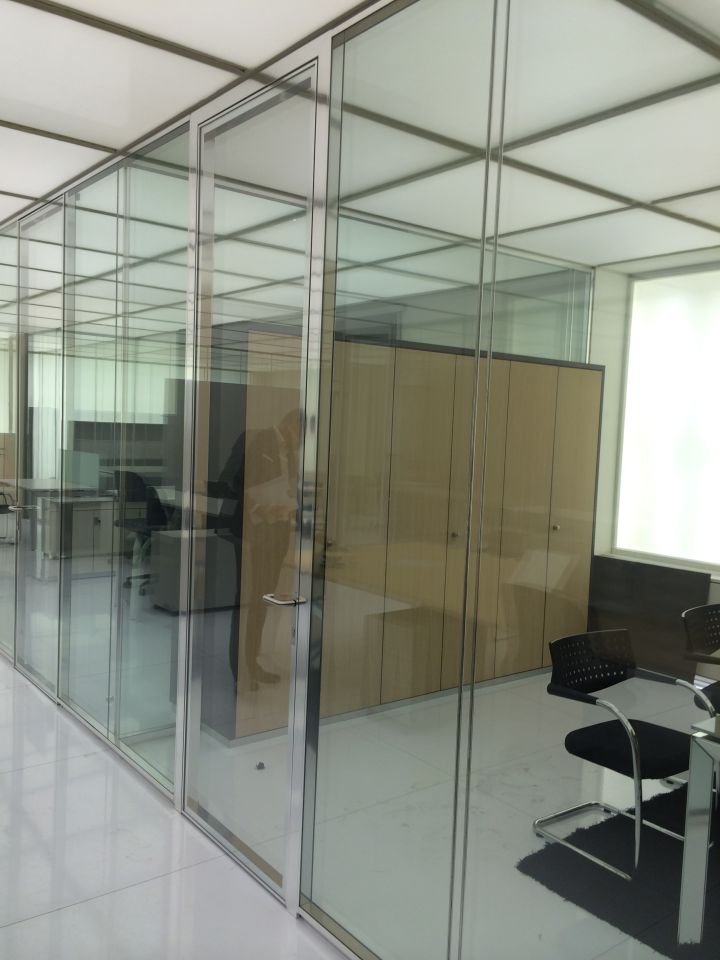 - суцільноскляні подвійні офісні скляні перегородки. Ціна трохи вище, ніж у минулого варіанту. При виготовленні застосовуються загартовані полотна з товщиною 6-12 міліметрів, спеціальна фурнітура, профіль (в нього вставляється полотно). Для заповнення стиків використовуються ті ж матеріали, що і в попередньому випадку. Замовляючи такі суцільноскляні перегородки для офісу, ви можете розраховувати на шумоізоляцію в межах 40 дБ.