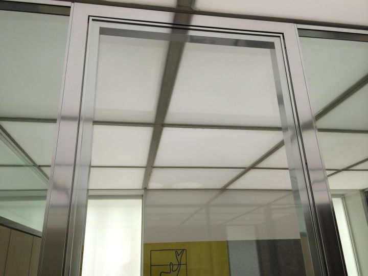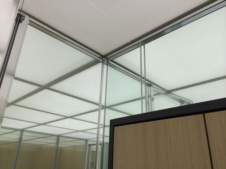 - рамні подвійні скляні офісні перегородки. Ціна ще трохи вище. Являють собою алюмінієвий каркас, в який вставлено полотно з товщиною 4-6 міліметрів. Така скляна перегородка в офісі забезпечить рівень шумоізоляції в 45 дБ.