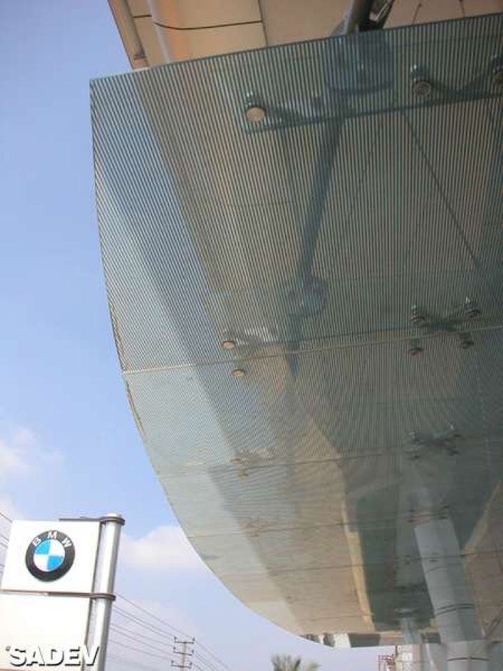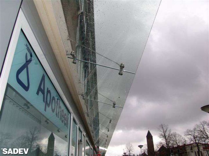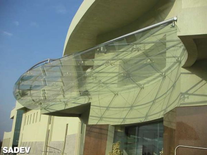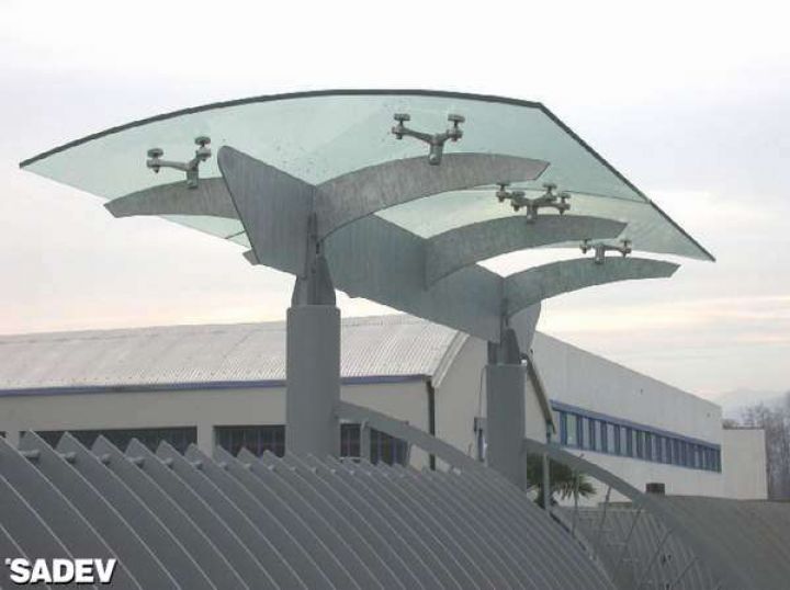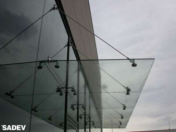 Навіси зі скла кріпляться до конструкції за допомогою спайдерной системи або точними шарнірними елементами, які необхідні для попередження руйнувань полотна. Ці всі комплектуючі розробляє французький виробник SADEV. У цій компанії є необхідні кріплення і для того щоб створити каркасну модель, і щоб отримати якісні скляні козирки і навіси без каркаса.