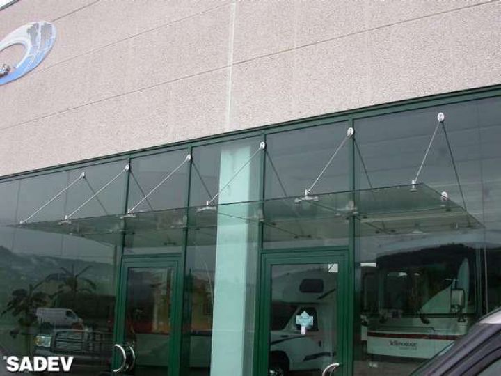 Суцільноскляні козирки ділять на наступні типи: моделі на каркасі і конструкції на розтяжках без каркаса. До першого типу відносяться моделі з виносною частиною, що перевищує 1800 міліметрів.